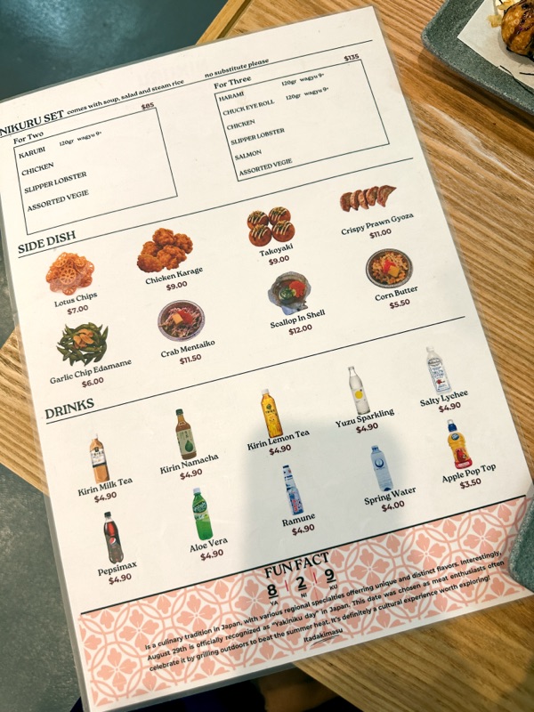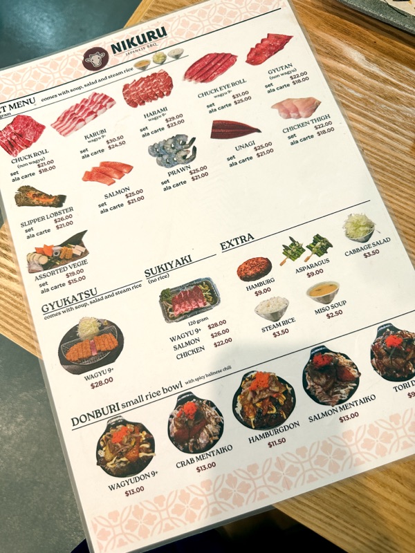 Once we’re seated, waitress came over and passed us the menu. I terus order je since we already knew what we wanted. So ordered set For Two which is ada wagyu Karubi, chicken, lobster, and vegies. Selalunya kita akan tambah ala carte non wagyu Chuck roll, prawns/ unagi/ donburi/ scallop dan takoyaki.